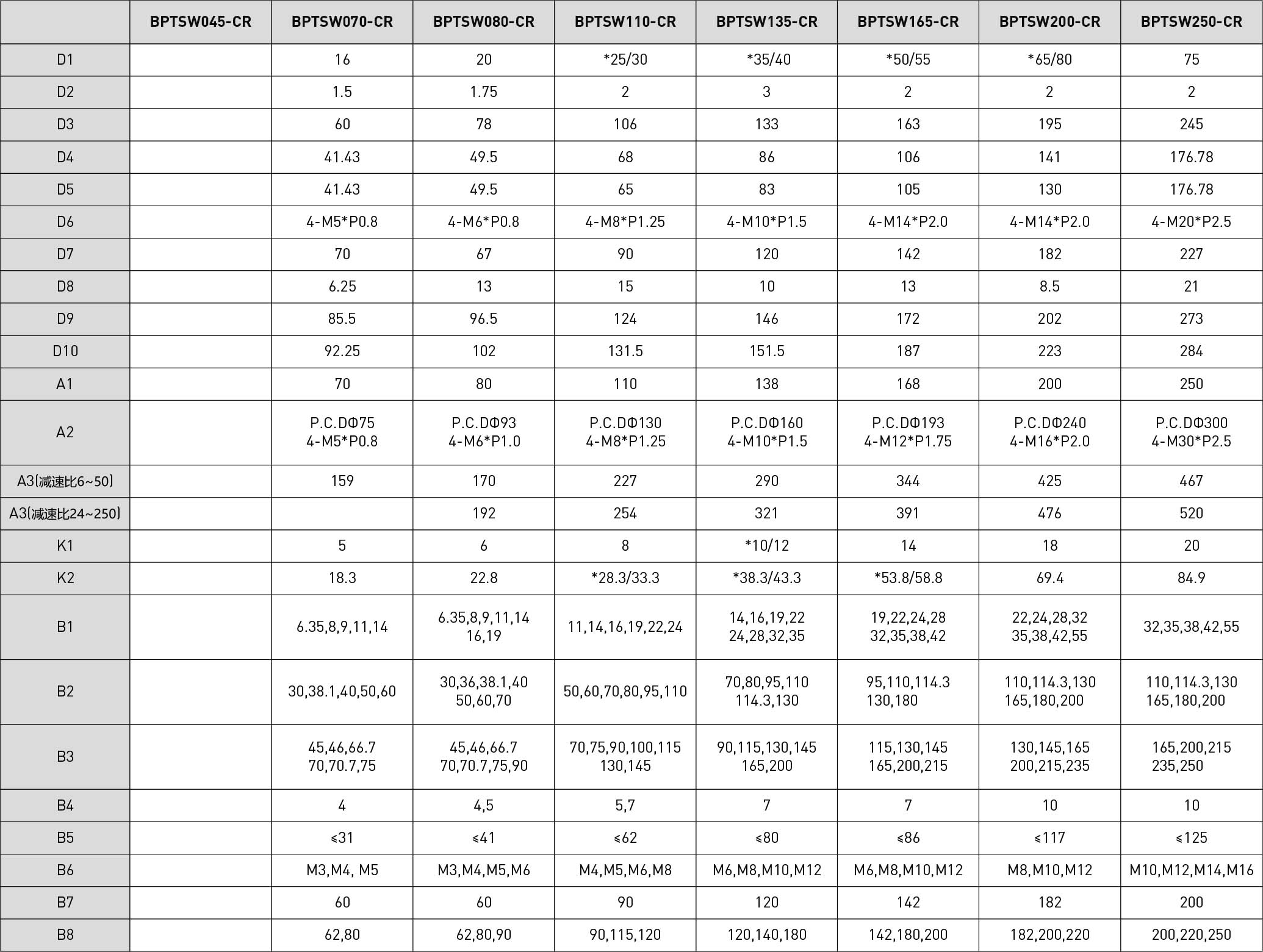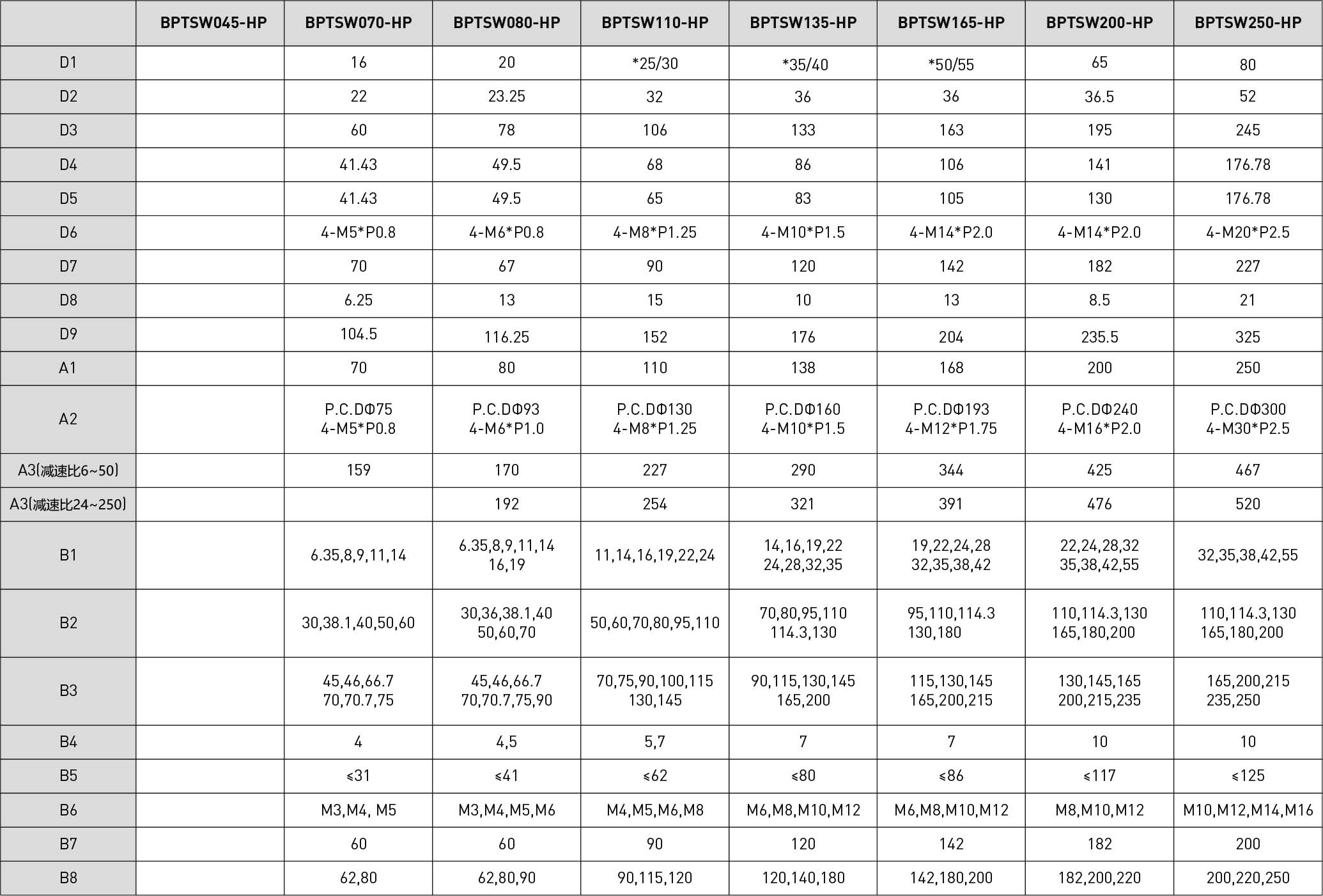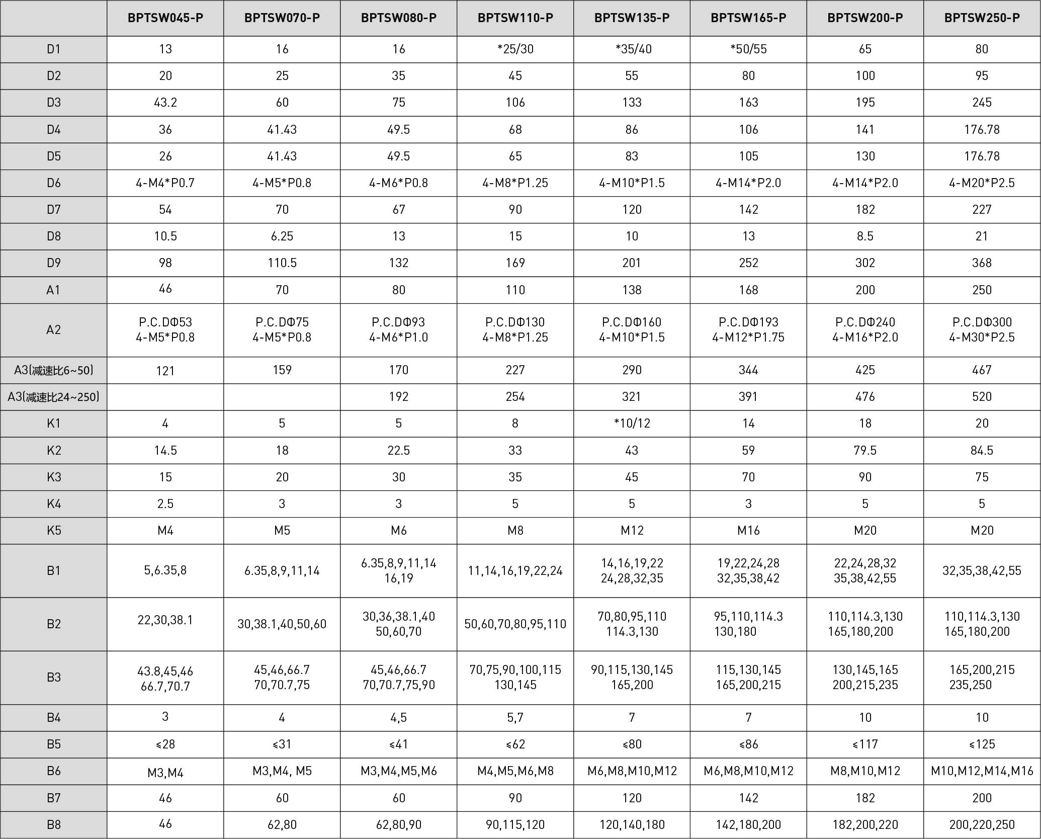 | 技术参数 | 单位 | 减速比 | BPTSW045 | BPTSW070 | BPTSW080 | BPTSW110 | BPTSW135 | BPTSW165 | BPTSW200 | BPTSW250 |