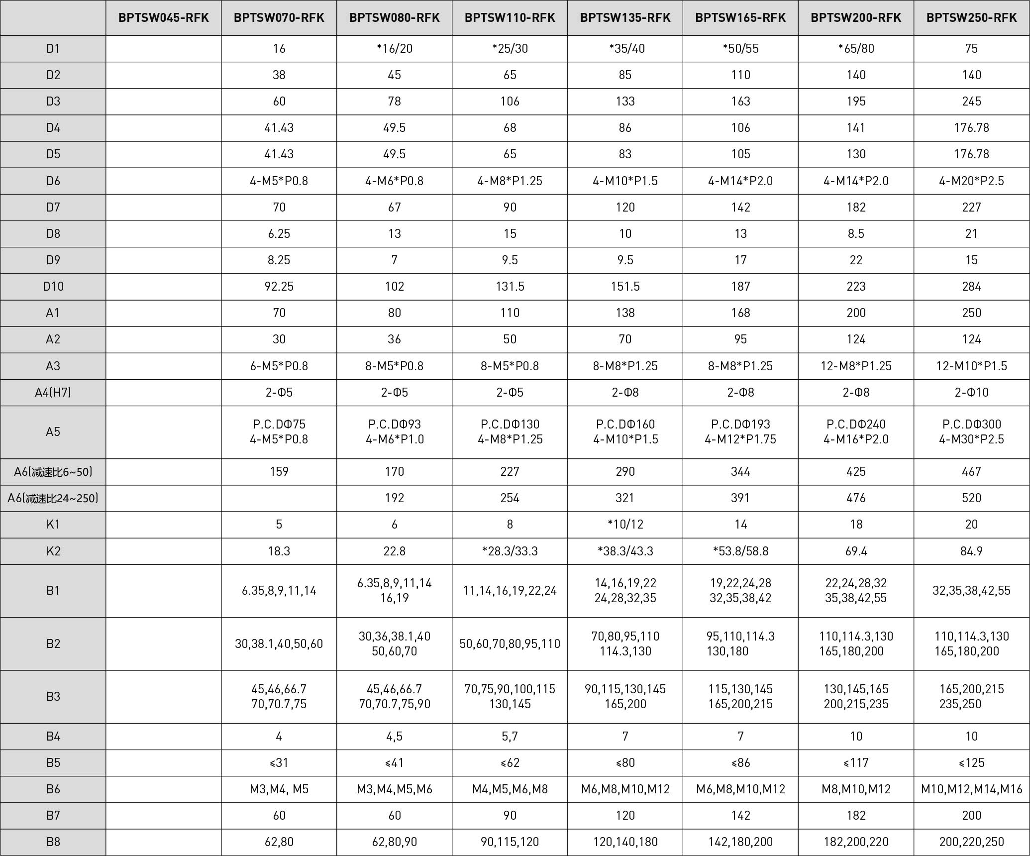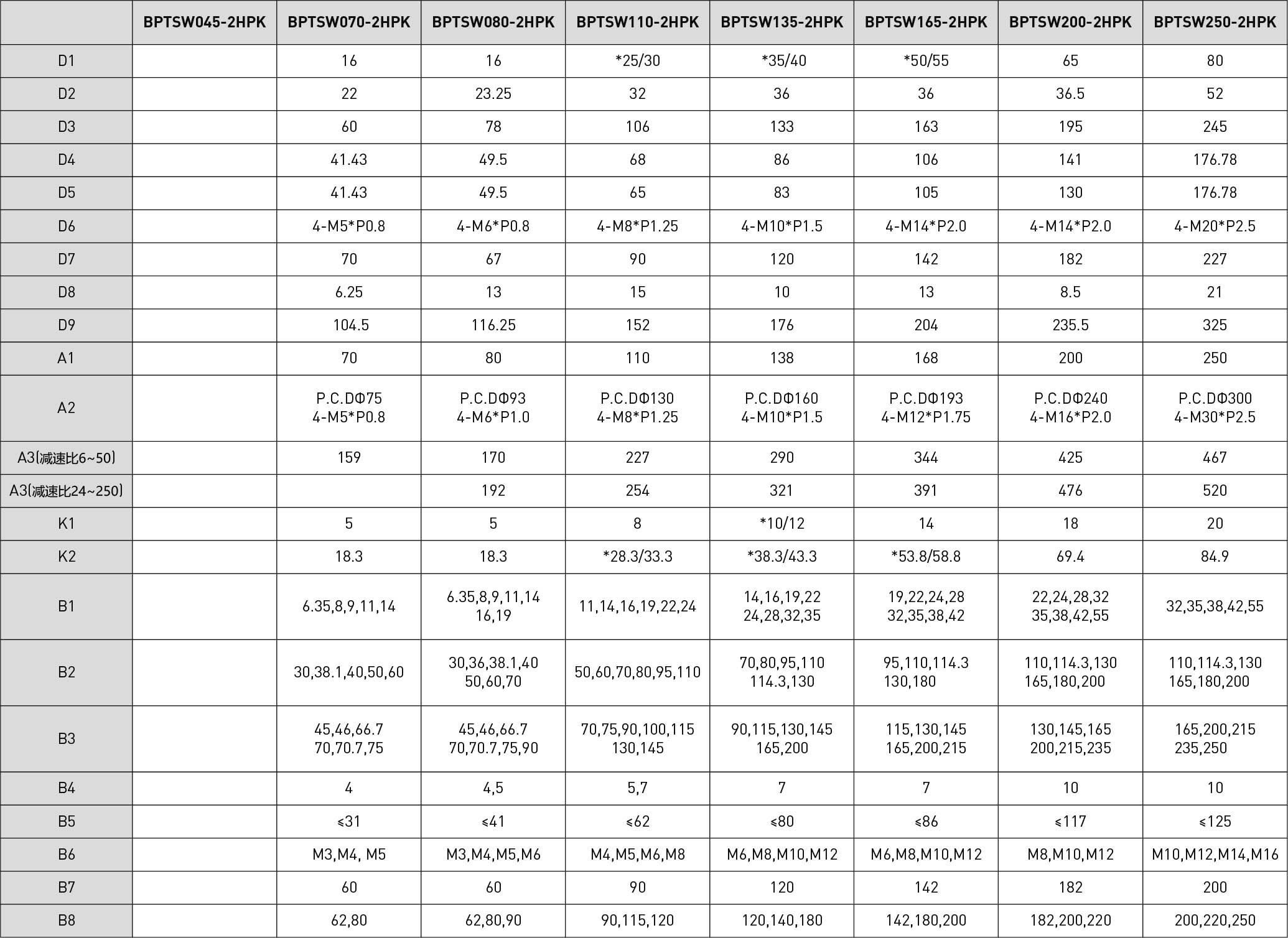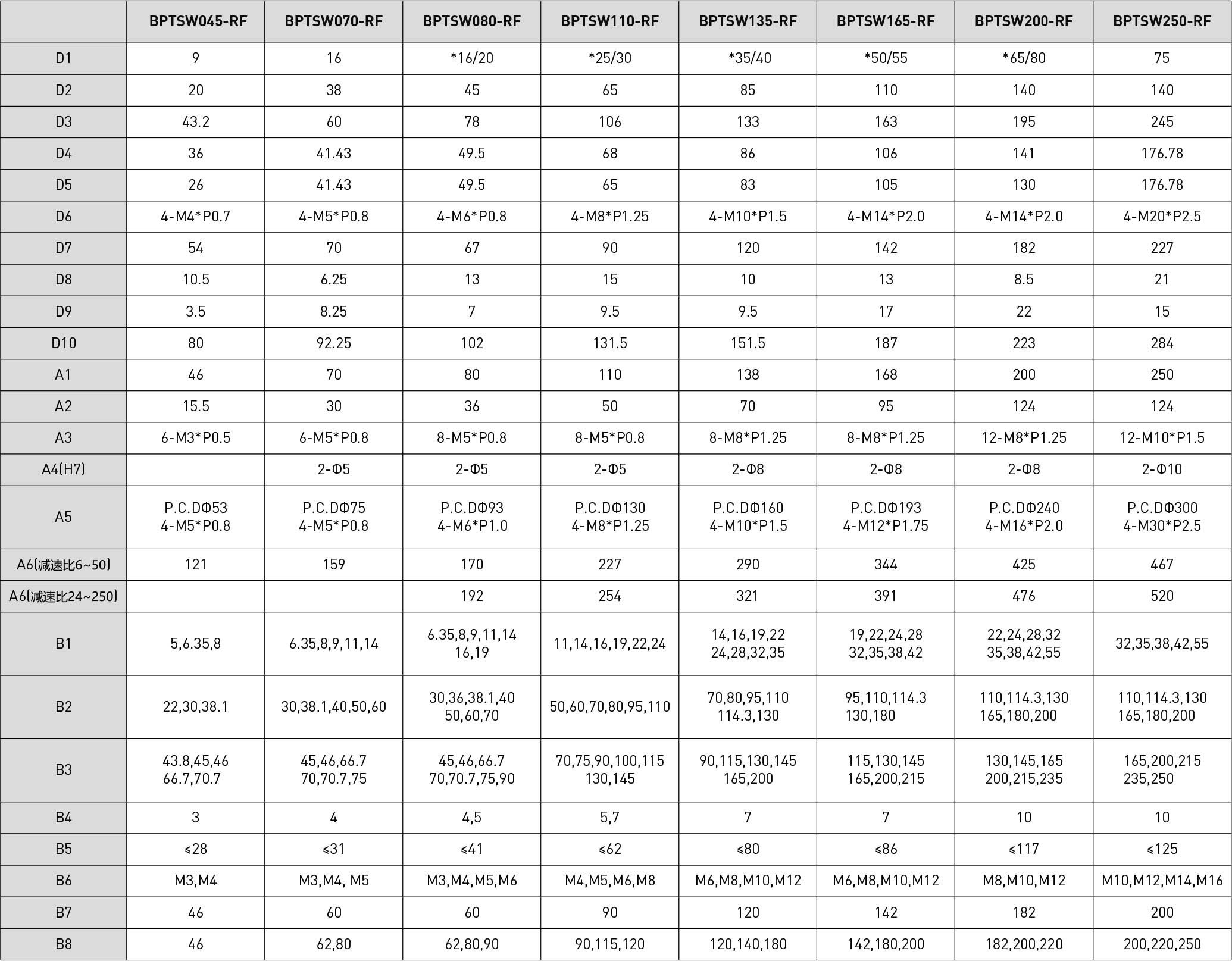 | 技术参数 | 单位 | 减速比 | BPTSW045 | BPTSW070 | BPTSW080 | BPTSW110 | BPTSW135 | BPTSW165 | BPTSW200 | BPTSW250 |